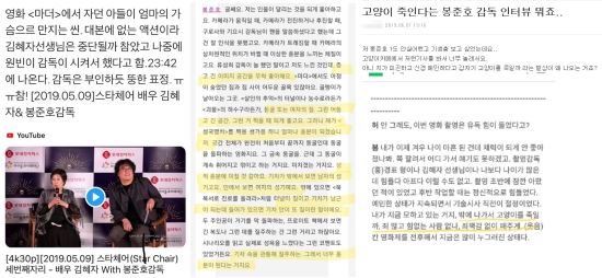 그리고 선생님께서 덧붙이시기를 “저 장면을 찍을 때 모자란 아들을 둔 마음이 복잡한 엄마로 누워 있었어요. 양말도 안 벗었어요. 만약 아들이 잘못되면 언제라도 뛰어나가야 하니까. 그런 엄마의 마음으로 연기를 했는데 이렇게 오해하시니까 제가 봉감독에게 너무나 미안하고 이 상황이 무섭습니다”라고 하셨습니다.