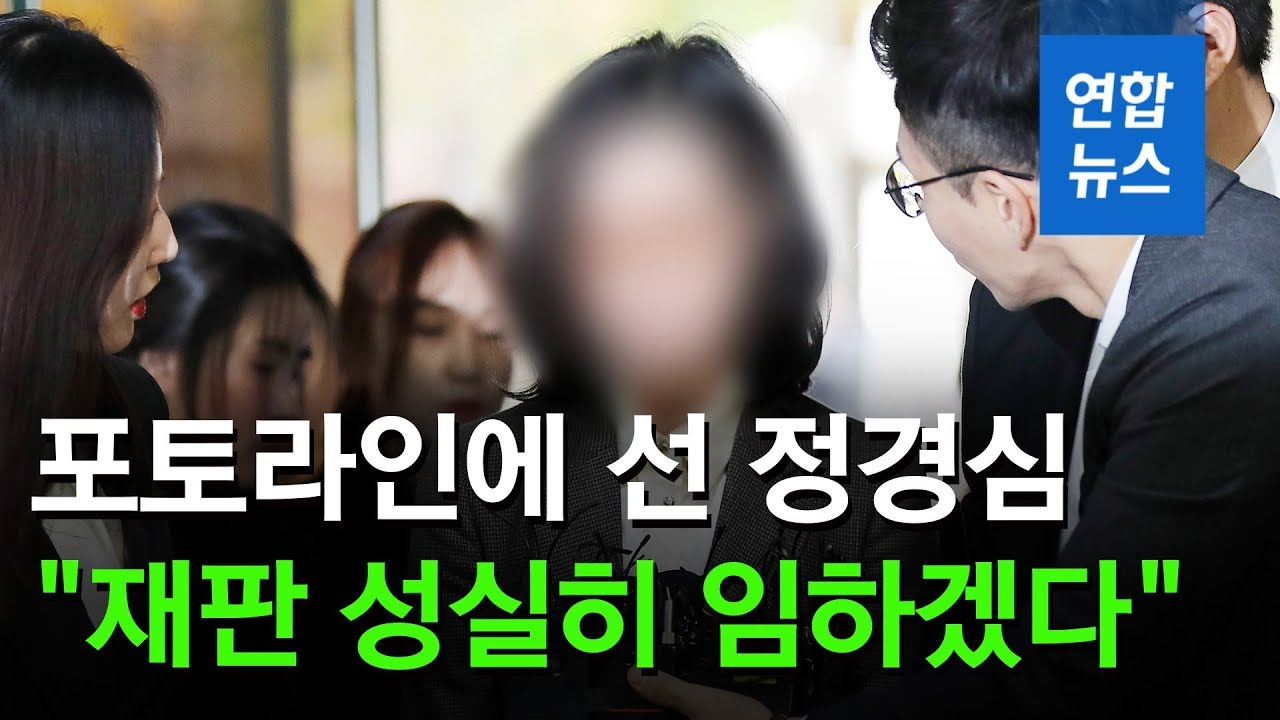정 교수는 “처음 포토라인에 섰는데 심경을 밝혀 달라”는 취재진의 질문에 함께 온 변호인들을 바라봤다. 변호인이 고개를 끄덕인 뒤에야 정 교수는 “재판에 성실히 임하겠습니다”라고만 말했다. 얼굴은 어두웠고 목소리는 작았다. “표창장 위조 혐의를 인정하느냐”, “검찰의 강압수사였다고 생각하느냐”는 질문에는 대답하지 않았다. 정 교수는 머리를 쓸어 올리며 변호인 2명과 법원 입구 보안검색대 쪽으로 발걸음을 옮겼다. 뇌경색과 뇌종양을 앓고 있다고 주장하는 정 교수의 걸음걸이는 빨랐다.