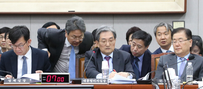 강 수석이 손에 쥔 노란색 책자를 흔들며 격한 어조로 항의를 이어가고, 노영민 대통령 비서실장도 불만을 드러내자 결국 회의 진행을 맡은 더불어민주당 원내대표인 이인영 운영위원장이 감사 중지를 선언했다.