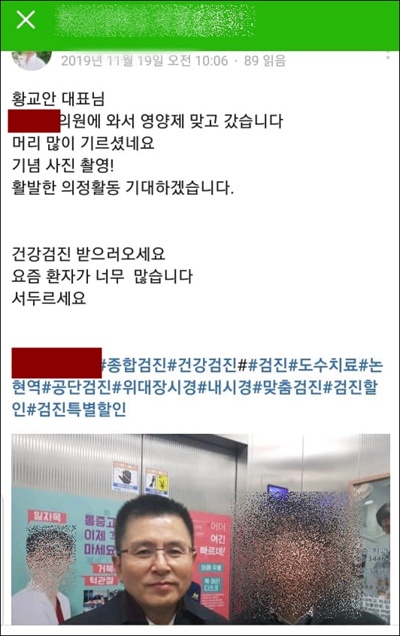 이 관계자는 "황교안 대표님, A의원에 와서 영양제 맞고 갔습니다"라며 "머리 많이 기르셨네요. 기념 사진 촬영! 활발한 의정활동 기대하겠습니다"라고 남기며 황 대표와 엘리베이터에서 찍은 사진을 올렸다. 병원 관계자는 이날 뉴시스에 "이렇게 (일이) 커질 줄 몰랐다"며 "병원에 높은 분이 오셔서 기념사진을 찍은거다. 도용하거나 한건 아니지만 스트레스를 많이 받고 있다"고 토로하기도 했다.