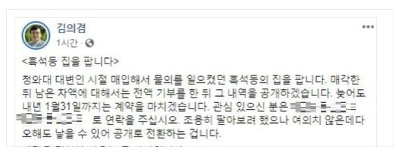 앞서 김 전 대변인은 지난 1일 자신의 페이스북에 “청와대 대변인 시절 매입해 물의를 일으킨 흑석동 집을 판다”고 밝혔다. 또 부동산 매각 차액은 전액 기부하고 내역도 공개하겠다는 뜻도 밝혔다.