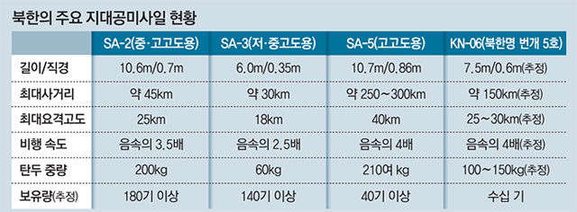 북한의 지대공 미사일 가운데 SA-5는 가장 긴 ‘눈(레이더)’과 ‘주먹(미사일)’을 갖고 있다. 옛 소련이 냉전시절 미 전략폭격기 요격용으로 개발한 SA-5는 레이더 탐지거리가 500km, 최대 사거리도 250∼300km에 달한다. 유사시 휴전선 인근에서 서울 등 수도권은 물론이고 충청지역 상공의 아군 군용기까지 ‘타깃’이 될 수 있다는 얘기다.