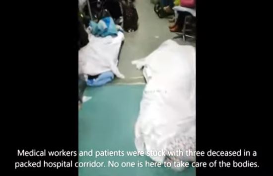 시신을 제때 처리하지 못하고 병원 복도에 방치했다는 고발 영상도 나왔다. 하얀색 모포로 덮힌 시신들이 환자와 가족들로 가득찬 병원 복도에 놓여 있다.