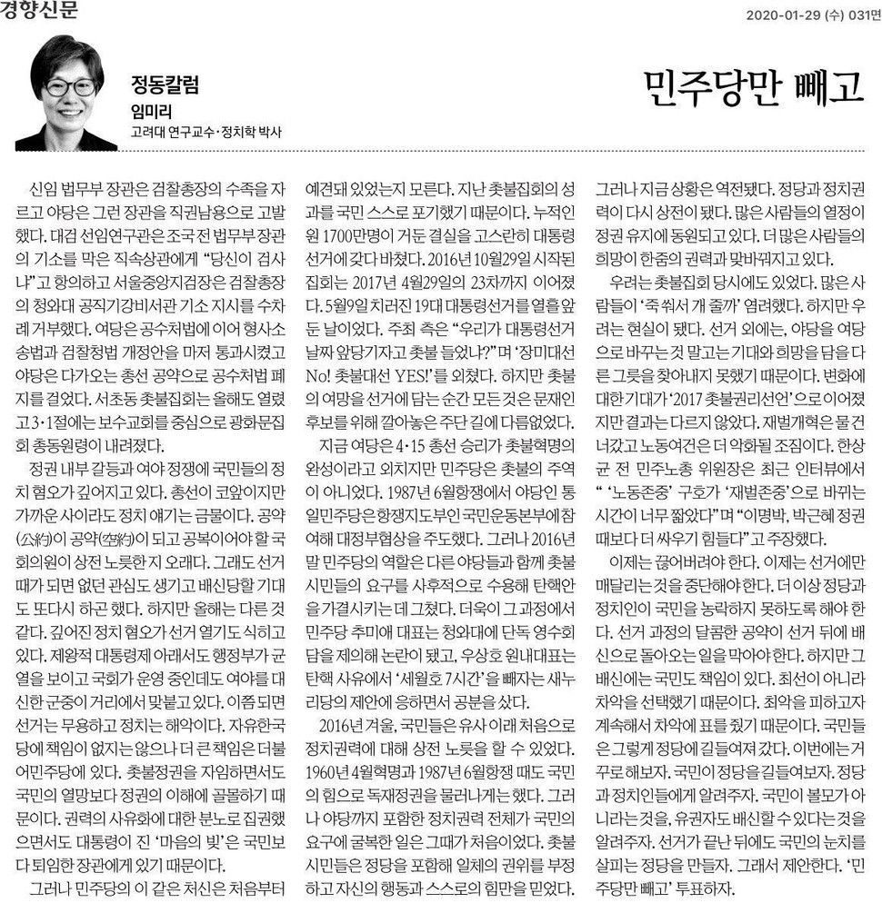 민주당, 비판 칼럼 쓴 임미리 교수·경향신문 고발…총선 앞두고 진보진영 분열 움직임 본문