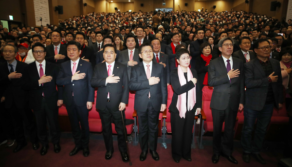 자유한국당과 새로운보수당, 미래를향한전진4.0(전진당)이 합친 미래통합당이 17일 공식 출범했다. 미래통합당은 이날 오후 국회 의원회관 대회의실에서 출범식을 가졌다. 약칭은 ‘통합당’, 상징색은 '밀레니얼 핑크'로 정했다. 박근혜 전 대통령 탄핵 사태로 분열했던 보수 정파가 총선 58일 남겨둔 상황에서 하나로 뭉치고, 여기에 중도 세력이 합류하면서 더불어민주당에 맞선 단일대오를 갖춘 것이다.
