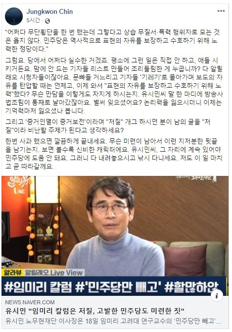 유시민 “임미리 칼럼은 자기 기분대로 쓴 저질, 민주당 고발은 쓸데없고 미련한 짓” 본문