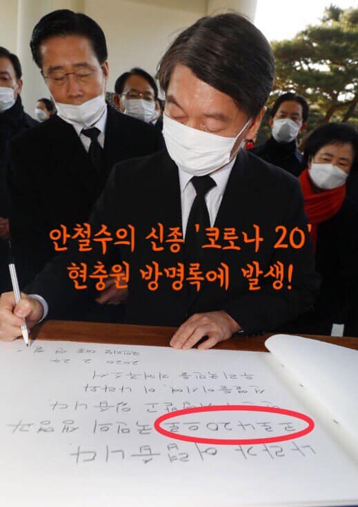 안철수 국민의당 대표가 24일 서울 동작구 국립서울현충원을 방문해 방명록을 남기는 과정에서 신종 코로나바이러스 감염증(코로나 19)을 '코로나 20'으로 표기해 구설에 올랐다.
