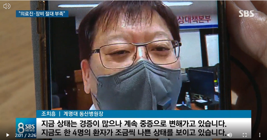 환자와 보호자들은 많이 불안해하고 있다고 한다. 중증환자가 늘고 있어 의료진들은 긴장을 늦출 수 없다. 조치흠 동산병원장은 “이 장소는 음압 시설이 갖추어진 장소다. 지금 상태는 경증이 많으나 계속 중증으로 변해가고 있다. 지금도 한 4명의 환자가 조금씩 나쁜 상태를 보이고 있다”라고 전했다.
