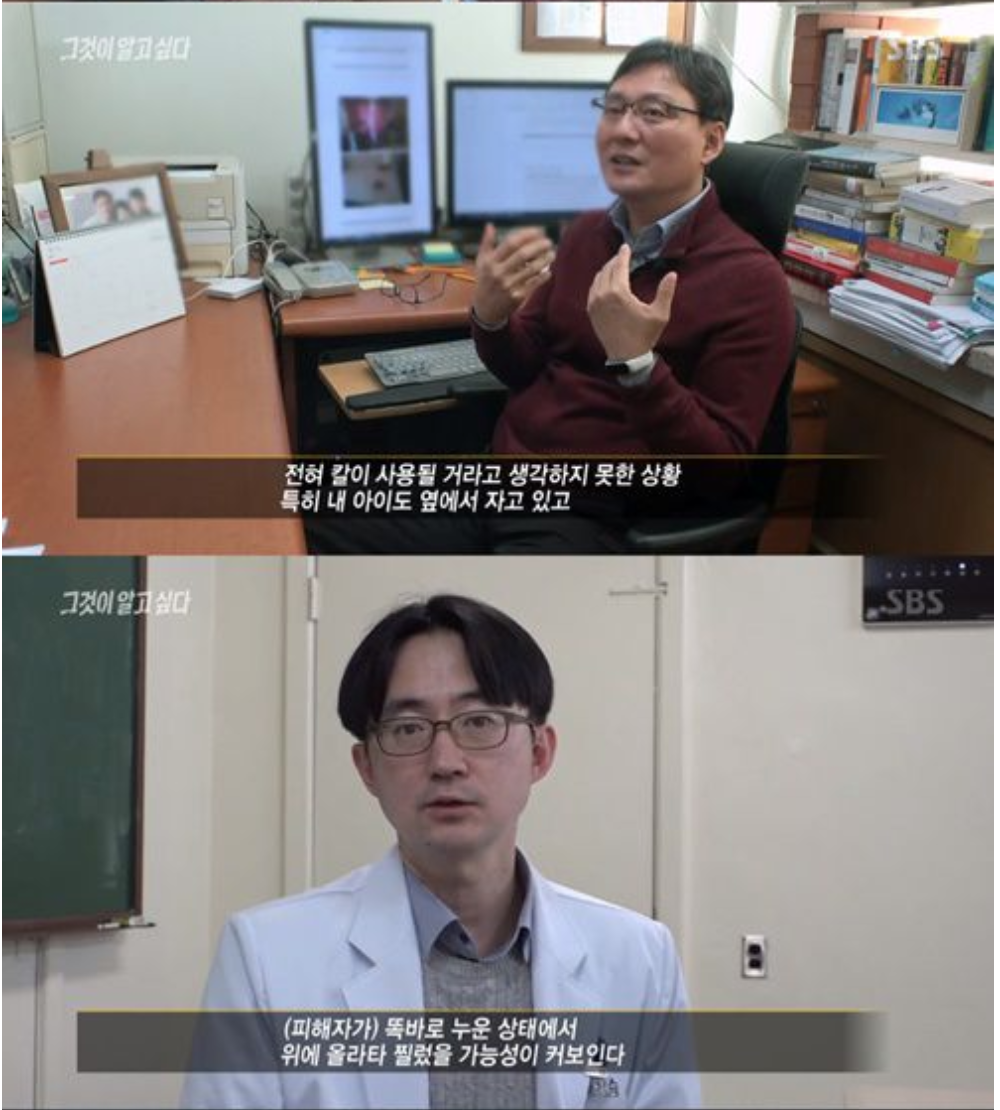 전문가들은 살해할 의도를 가지고 강력한 힘으로 찔렀을 것이라 분석했다. 이들은 기도가 절단된 상태라 비명 한번 지르지 못한 채 사망했을 것이라고 추정했다. 이호 전북대 법의학과 교수는 모자의 상태에 말을 잇지 못했다. “엄마는 저항하지 못했다”고 하는 이 교수는 “칼이 사용될 것이라 생각을 못한 것 같다”고 말했다.