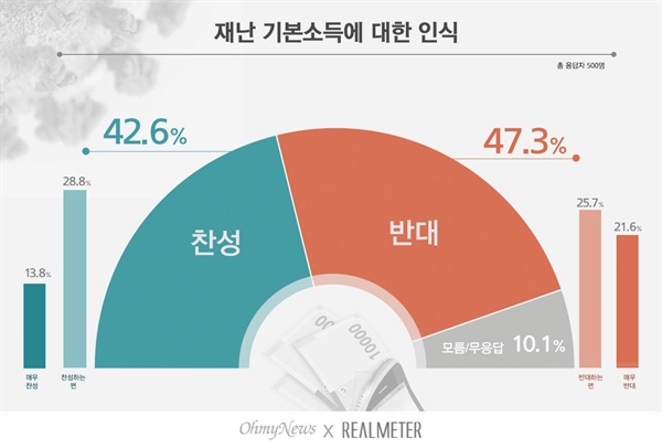 조사 결과, 재난 기본소득 도입에 '찬성한다'는 응답이 42.6%, '반대한다'는 응답이 47.3%로 나타났다. 반대가 찬성보다 다소 높게 나왔지만 두 응답의 격차는 4.7%p로 오차범위(±4.4%p) 안이었다. 모름/무응답은 10.1%였다. 4점 척도로 살펴보면 "매우 찬성" 13.8%, "찬성하는 편" 28.8%, "반대하는 편" 25.7%, "매우 반대" 21.5%였다. 약한 찬성과 약한 반대가 엇비슷한 가운데 강한 반대가 전체 무게추를 반대 쪽으로 기울게 한 모양새다.
