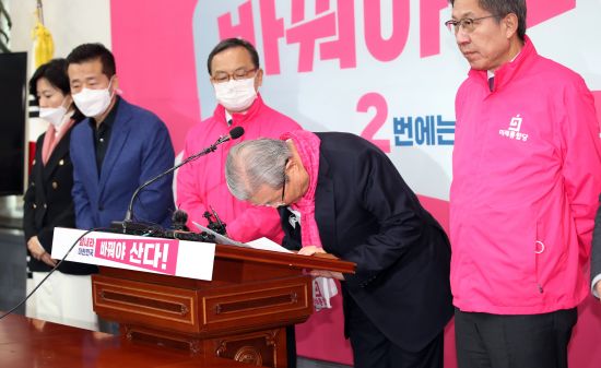 그는 이날 차명진(경기 부천병)·김대호(서울 관악갑) 후보 등의 ‘막말 릴레이’에 여론이 싸늘하게 얼어붙자 선거 총책임자 자격으로 대국민 사과를 했다.