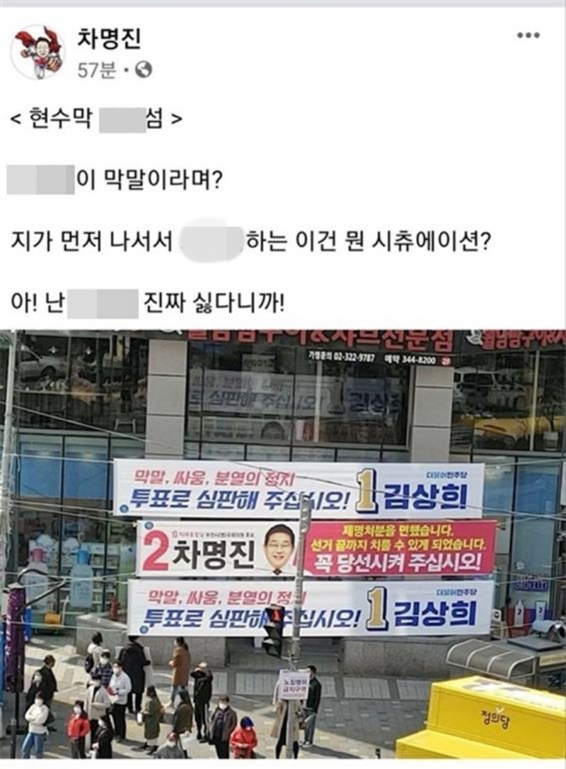 이후 차 후보는 지난 11일 자신의 페이스북(SNS)에 '○○○ 현수막 '이라는 제목의 글과 함께 더불어민주당 김상희 후보의 현수막이 자신의 현수막 위아래로 배치된 사진을 게시하면서 "○○○이 막말이라며? 자기가 먼저 나서서 ○○○하는 이건 뭔 시츄에이션? 아! 난 ○○○ 진짜 싫다니까"라는 글을 올려 다시 논란을 빚었다. 해당 글은 현재는 삭제된 상태다.