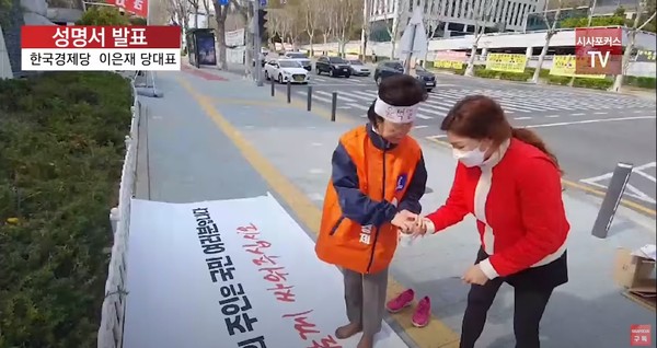 이은재 대표는 12일 서초동 대검찰청 앞에서 발표한 성명에서 “문재인 종북 좌파정권은 윤석열 검찰총장 죽이기에 본격적으로 나섰다”며 혈서를 쓰고 있는 사진을 공개했다. 이은재 대표는 “윤석열을 살리고 대한민국의 헌법체제를 수호할 사람이 누구인가? 한국경제당을 선택해주시면 이은재가 21대 국회에서 윤석열 검찰총장의 호위무사가 되어 윤석열을 지키겠다”고 선언했다.