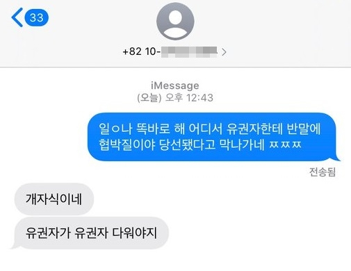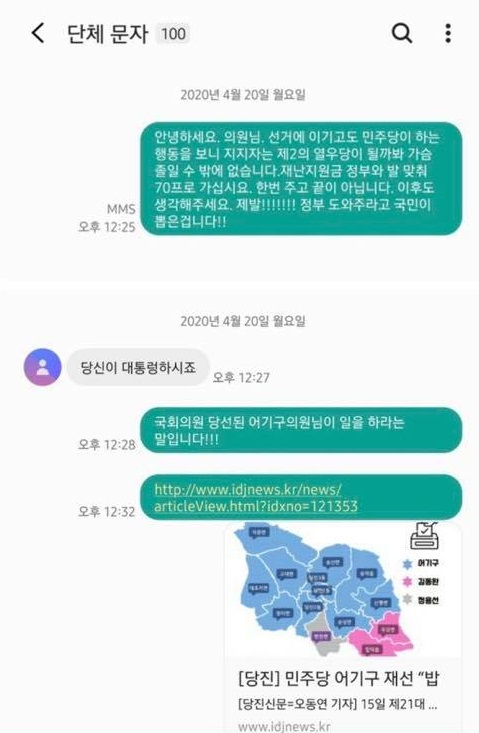 어 의원의 이같은 태도가 알려지자 다른 유권자 B 씨도 문자메시지를 보내 "일이나 똑바로 하라. 어디서 유권자한테 반말에 협박질이냐. 당선됐다고 막 나가네"라고 질타했다.