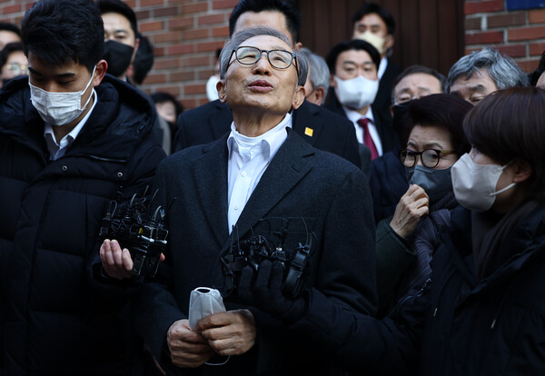 윤석열 대통령의 신년 특별사면으로 사면·복권된 이명박 전 대통령이 2022년 12월 30일 오후 서울 논현동 자택에 도착해 대국민 메시지를 발표하고 있다. /연합뉴스