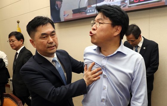 그런데 장 의원이 ‘법적’으로 나갈 수 없음에도 그에 아랑곳하지 않고 나가려다 사달이 났다. 위원장의 요청에 국회 직원이 달려가 장 의원을 막아서자 장 의원은 “뭐야 이거”라고 소리 지르며 “어디 잡았어? 나 밀었죠. 안 밀었다고? 경호 책임자 나와”라고 반말로 소리쳤다.