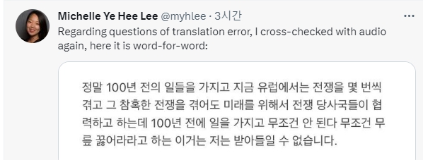 워싱턴포스트 기자인 Michelle Ye Hee Lee는 자신의 SNS에 올린 글에서 “녹음 파일을 갖고 재차 교차 검증했다. 한 마디 한 마디 문자 그대로(word-by-word) 올린다”고 밝혔다. 워싱턴포스트 기자가 공개한 녹취록에 따르면 윤 대통령은 “정말 100년 전의 일들을 가지고 지금 유럽에서는 전쟁을 몇 번씩 겪고 그 참혹한 전쟁을 겪어도 미래를 위해서 전쟁 당사국들이 협력하고 하는데 100년 전에 일을 가지고 무조건 안 된다, 무조건 무릎 꿇어라라고 하는 이거는 저는 받아들일 수 없습니다”라고 발언한 것으로 돼 있다. 여기에는 분명히 ‘저는’이라는 주어가 들어가 있다.
