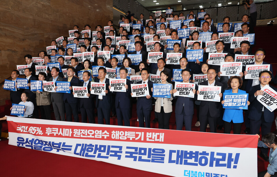 먼저 민주당의 향후 초강경 대응이 주목된다. 민주당은 IAEA 보고서를 ‘깡통 보고서’라고 비판하며 보고서 자체의 신뢰성에 심각한 의문을 제기하고 있다. 민주당은 “IAEA 보고서는 일본 맞춤형 용역 보고서라며 모든 방법을 동원해 오염수 방류를 막겠다”고 선언했다.