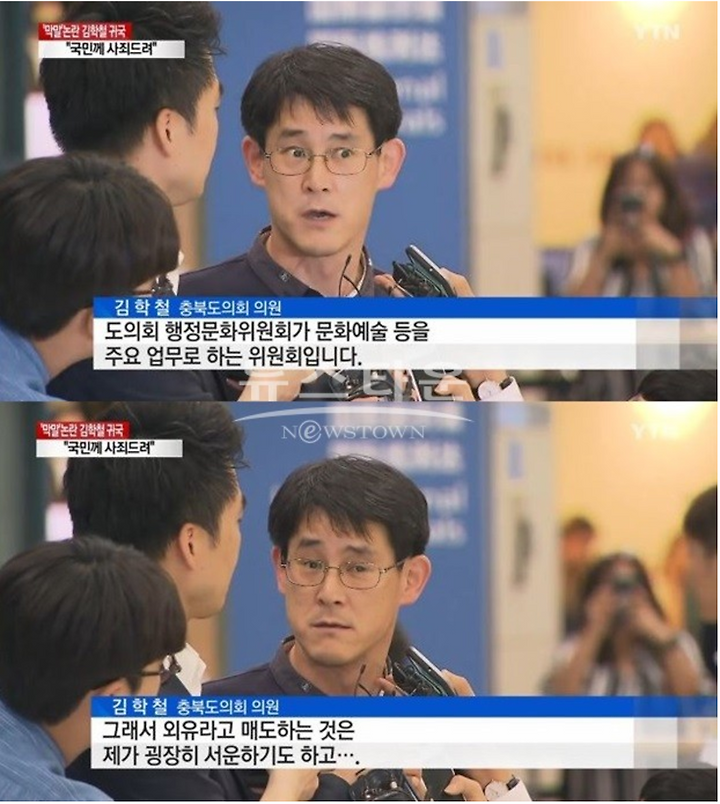 김학철 충북도의원이 해명에 나섰다. 김학철 충북도의원은 23일 자정 충북도청 대회의실에서 열린 기자회견을 통해 자신의 입장을 밝히며 국민에게 사죄를 표했다.