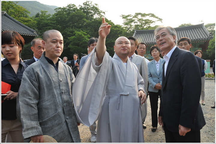 문재인 대통령이 지난 2012년 6월 민주당 대선후보 시절 자신이 고시공부를 하던 해남 대흥사를 찾아 설명을 듣고 있다.