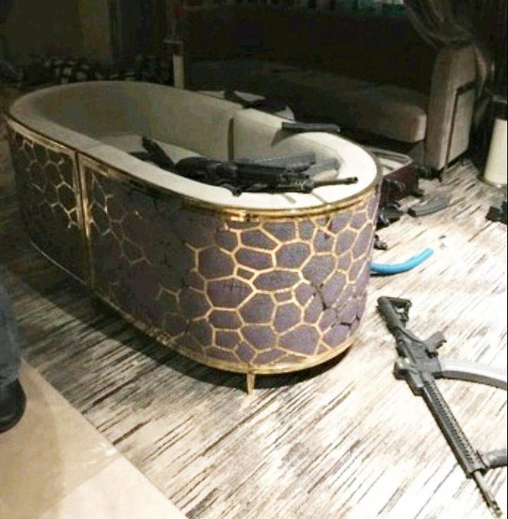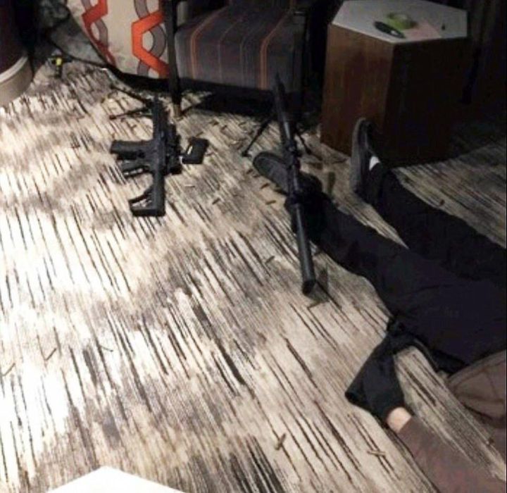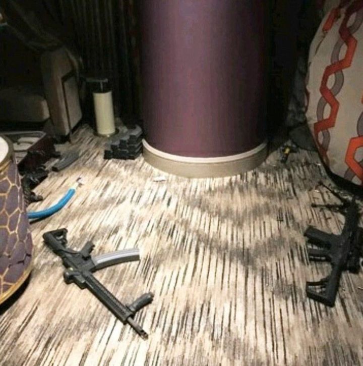 다른 사진은 범행에 사용된 자동소총 등이 널부러져 있는 모습도 보인다. 패덕은 약 600파운드(한화 약 92만원)짜리 호텔룸에 묵었던 것으로 알려진다. 패덕의 방에서는 23개의 각종 무기들이 발견됐는데 일부 소총은 거치대까지 설치돼 있는 모습이 보인다 .