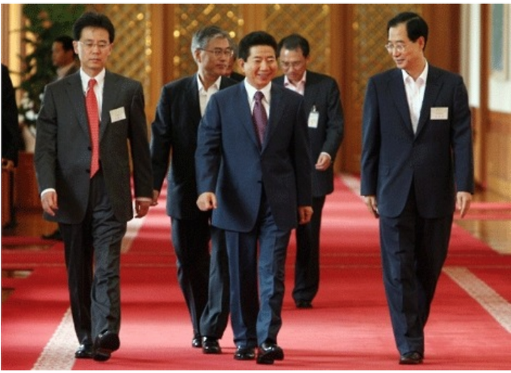노무현 전 대통령 재임 시절 김현종 통상교섭본부장(왼쪽)과 문재인 비서실장, 변양균 전 기획예산처 장관, 한덕수 경제부총리 등이 보인다.