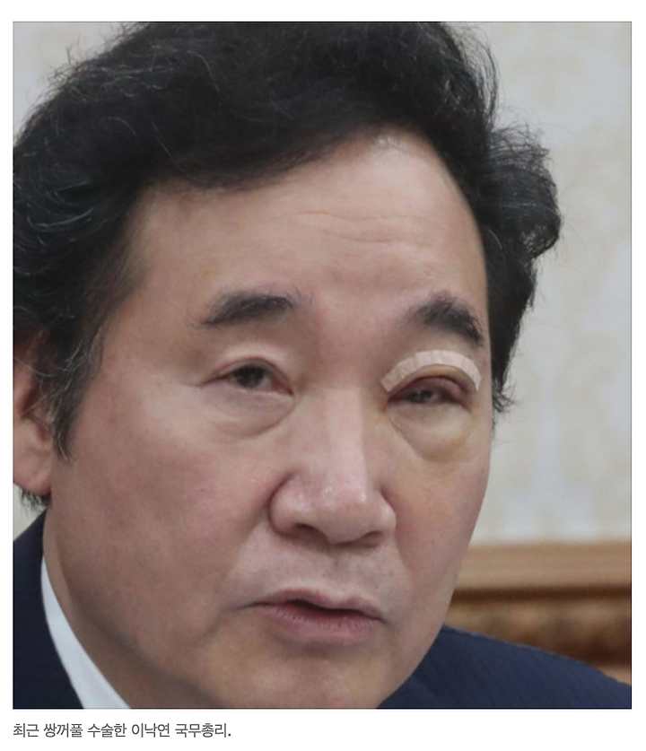그런데 며칠 전에 이 총리가 쌍꺼풀 수술을 했다. 과거 고 노무현 전 대통령도 2005년 2월 4일 쌍꺼풀 수술 전력이 있다. 권양숙 여사도 동반해 눈을 건드렸다. 눈꺼풀이 처지는 상안검이완증 때문에 수술했다.
