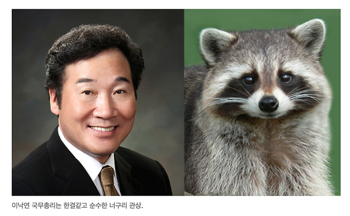 이낙연 총리 관상은 너구리 관상이다. 너구리는 구환(拘貛), 산달(山獺)로도 부른다. 다소 둔해 보이는 외모로 인해 능청스럽거나 미련한 동물로 인식하지만 실상은 영리하다. 흙이 묻은 고구마, 감자를 물속에 넣고 앞발로 씻어 먹는 똑똑한 동물이다.