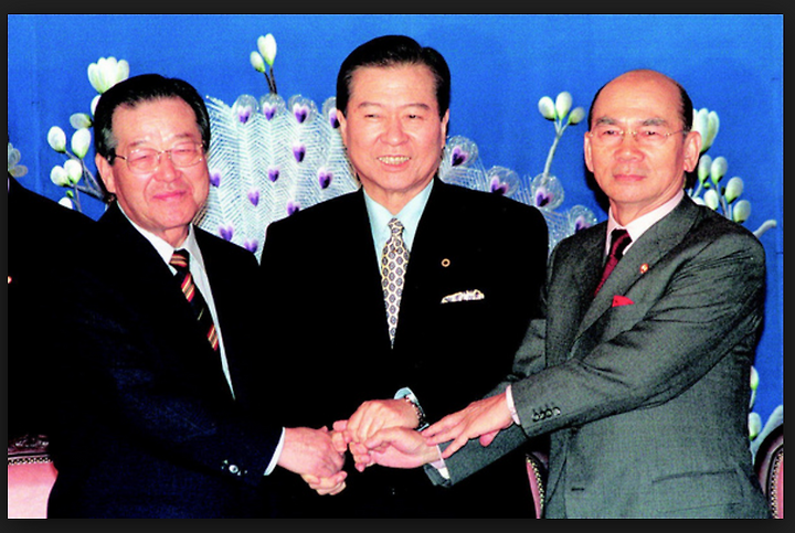 ▲ 한국 정치사에서 거의 기적의 통합으로 평가받고 있는 `DJP 연합` 때의 김종필 김대중 박태준.