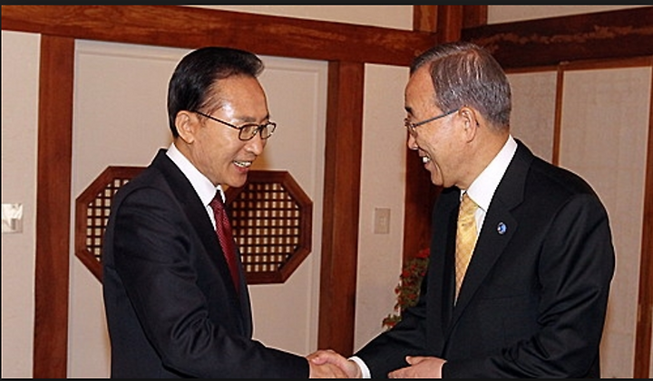 하지만 무슨 생각에서였는지, 진짜 ‘돈’이 없었는지, 그는 대뜸 귀국 일주일여가 지나자 이명박 전 대통령을 예방했다. 그것도 ‘녹색성장 아젠다를 이어받겠다’는 헌사까지 곁들여서. 이명박 정부 2.0으로 스스로를 자리매김 하는 순간이었다. 그동안 하늘 위에서 고매하게 때를 기다리던 반기문의 첫 기착지는 바로 ‘이명박’이었다. 이명박이 누구인가. ‘이명박근혜 정부’라는 말이 있을 정도로 보수층의 대표 주자이자 박근혜 정부와도 연결성이 있는 전직 대통령이 아닌가. 정두언 전 의원은 이에 대해 “(이명박 전 대통령을 예방한 순간부터) 그런데 벌써 이미 여권 후보로 각인이 돼버리고 그러니까 정권 심판 프레임에 들어와 버린 거예요. 메시지가 다 그래요. 그러니까 생각해 보세요. 이명박, 박근혜 지금 여권이 10년 집권하고 있잖아요”라고 지적했다.