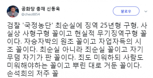 신 총재는 14일 자신의 트위터를 통해 "검찰 '국정농단' 최순실에 징역 25년형 구형"이라며 "사실상 사형구형 꼴이고 현실적 무기징역 구형 꼴이다"라고 글을 남겼다.