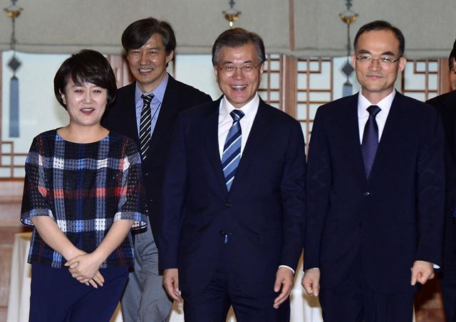 ▲ 지난 2017년 7월 25일 문무일 신임 검찰총장이 청와대에서 문재인 대통령으로부터 임명장을 받은 뒤 부인과 함께 기념사진 촬영을 하고 있다. 뒤에 조국 민정수석 모습도 보인다.