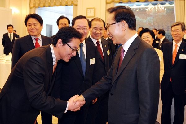 ▲ 지난 2010년 취임 2주년을 맞은 이명박 대통령이 청와대에서 한나라당 당직자들과 오찬을 앞두고 정두언 의원과 악수하고 있다.