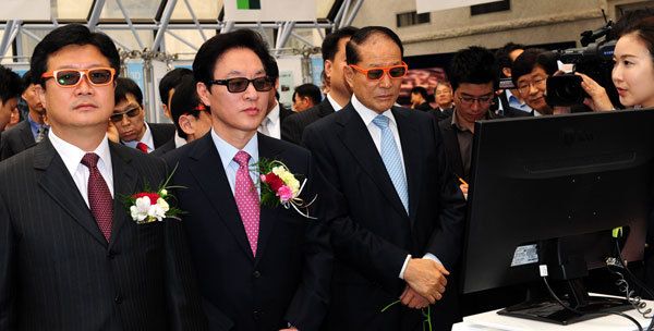 ▲ 지난 2011년 5월 `3D 산업 글로벌 강국 도약의 길` 전시회에서 3D TV를 시청하고 있는 정태근·정두언·이상득 의원(왼쪽부터).