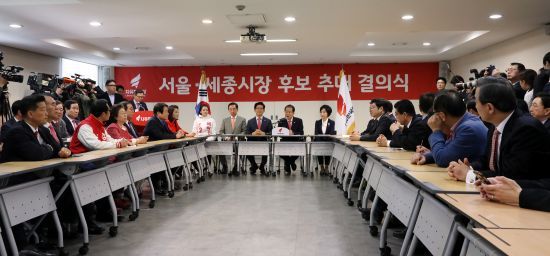 10일 오전 서울 영등포구 여의도 자유한국당 당사에서 진행된 서울·세종시장 후보 추대 결의식에서 김문수 서울시장 예비후보, 홍준표 대표, 송아영 세종시장 예비후보 등 참석자들이 기념촬영을 하고 있다.